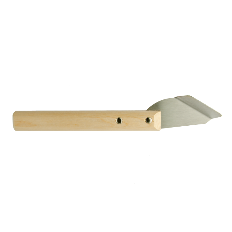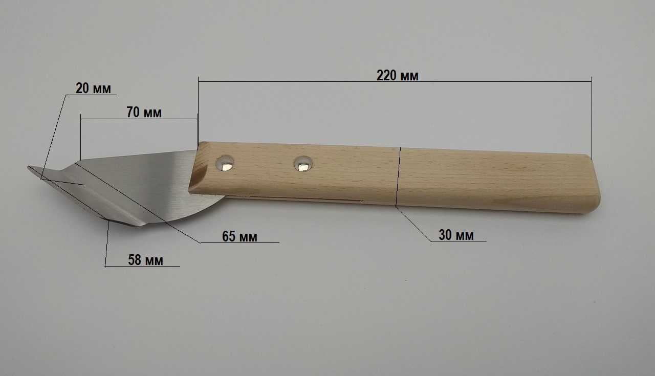 Крепление деталей лопатки выполнено винтовыми соединениями. Необработанная лакокрасочными покрытиями ручка прочно располагается в руке монтажника.