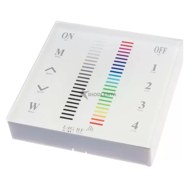 Панель сенсорная, работает от двух батареек AA, не требует подводки проводов. Синхронизируется с контроллерами RGB на 4 зоны по радио каналу на частоте 2,4Ггц